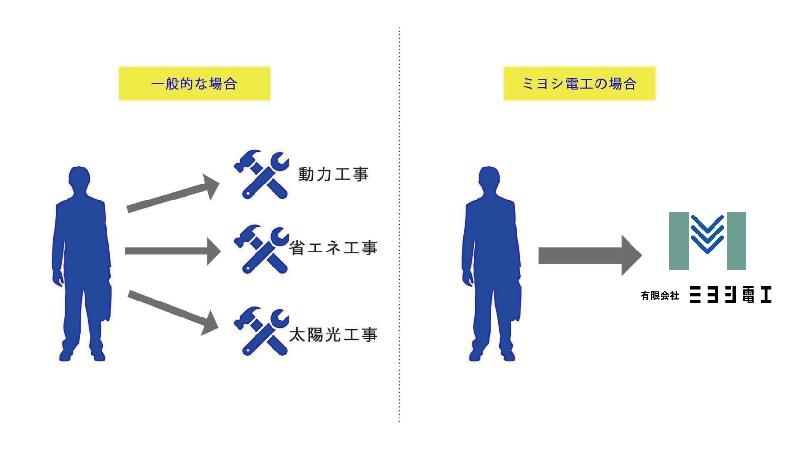 ミヨシ電工はさまざまな電気工事に、一式対応することが可能です。どのようなお悩みごとでも、すべてわたしたちが解決いたしますのでご相談ください。また、各種電気工事をまとめてご依頼いただけばコストカットにも繋がりますので、複数のお困りごとがある場合には、併せてのご依頼をおすすめしております。