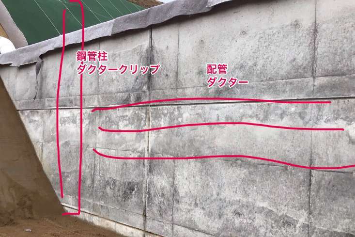 堤体にて鋼管柱と配管の固定箇所を確認