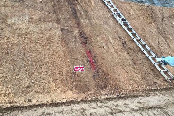 先ほどの写真に続いて、雨水排水溝のブロックが据え付けられています。赤印の箇所に電柱を建てていきます。