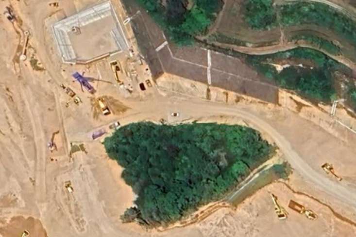 中央を境に、右側が1工区の新規処分場、左が2工区の新設水処理施設になります。写真中央に堤体が設けられます。