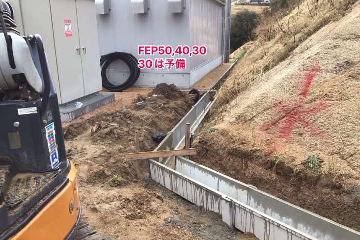 今回は新しい水処理施設に向けて掘削が進められる現場にて、処理施設の電力を引き込むための建柱と地中埋設管(FEP)径50mm、径40mmと予備の径30mmを敷設工事をおこなっていきます。